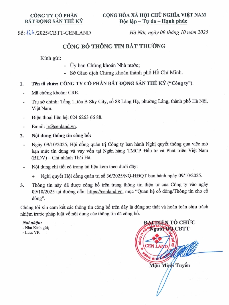 Công bố thông tin - Nghị quyết Hội đồng quản trị thông qua việc mở hạn mức tín dụng và vay vốn tại Ngân hàng TMCP Đầu tư và Phát triển Việt Nam (BIDV) – Chi nhánh Thái Hà